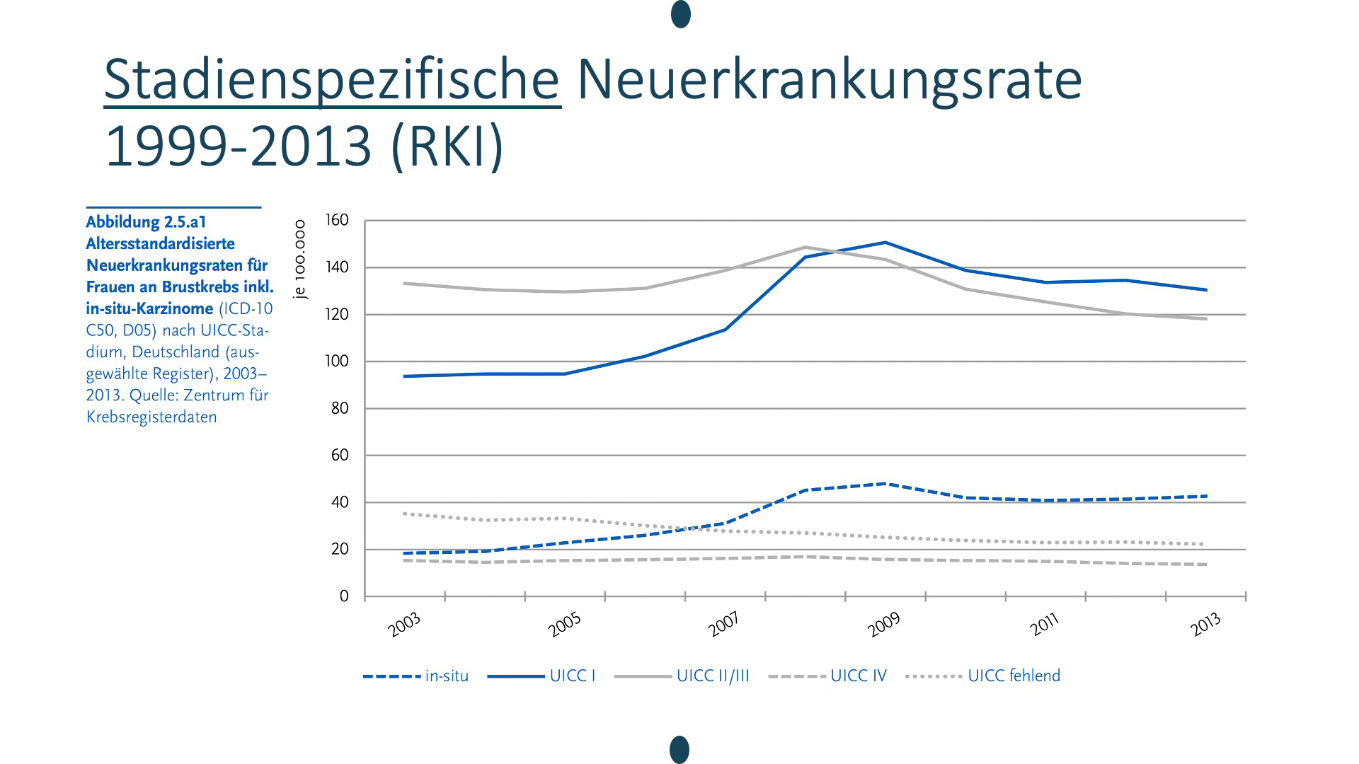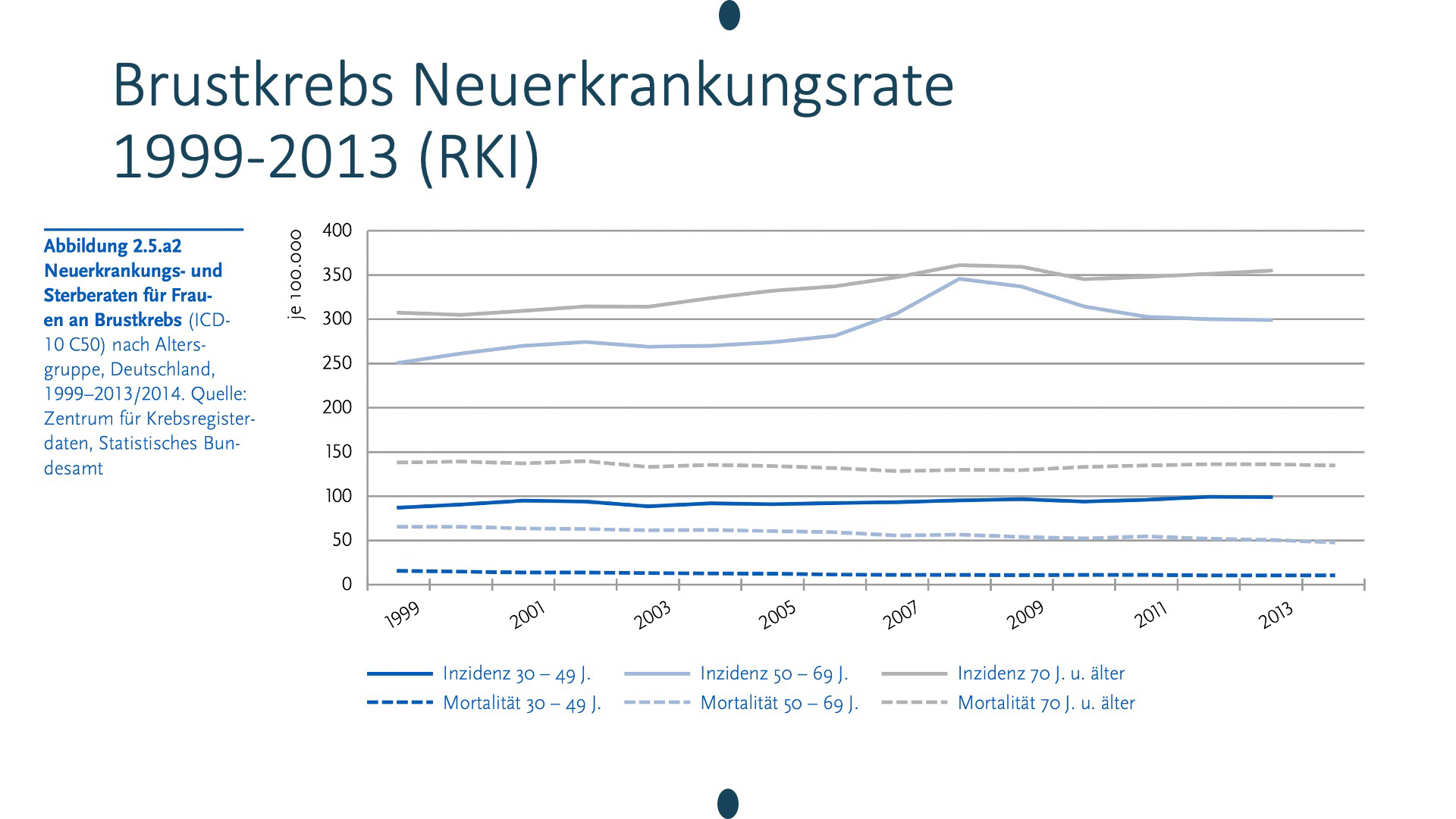 Auf dieser Abbildung erkennt man an der Kurve, dass Früherkennungsmaßnahmen Auswirkungen auf die Inzidenz haben: Die Neuerkrankungsrate geht erst mal hoch, wenn man anfängt Frauen im großen Stil zur Mammographie zu schicken.